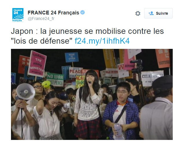 La jeunesse, habituellement silencieuse au Japon, s’est fortement mobilisée depuis plusieurs mois contre l’adoption de ces lois notamment au sein du SEALD (Students Emergency Action for Liberal Democracy). Ce mouvement étudiant pacifiste prend de l’ampleur au Japon, fort d’une excellente stratégie de communication, rapportée par France 24.